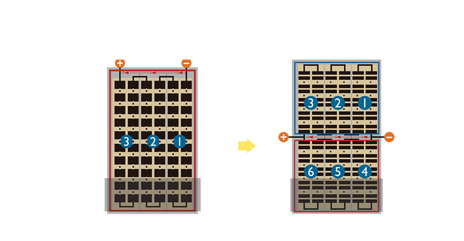 • 結合半切電池,降低遮陰影響、提升模組抗隱裂能力、並減少電阻損耗,進一步提升模組發電效能。